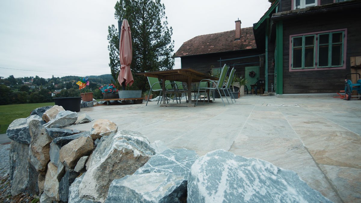 Eine dreistufige Steinschlichtung wurde meisterhaft errichtet, um eine erhöhte Terrasse zu schaffen, die nicht nur funktional, sondern auch optisch ansprechend ist. Auf dieser Terrasse wurden Keramikplatten verlegt, die Beständigkeit und Stil vereinen. Zudem haben wir die alte Betonstiege saniert, um den Gesamteindruck der Terrasse abzurunden.